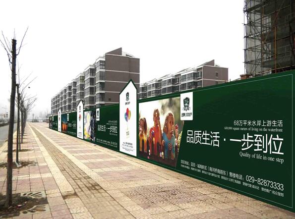 上海房地產圍擋廣告牌不但有圍欄的作用,更突出的特點是可以安裝畫(huà)麵,成為廣告宣傳的一種方式,多用於(yú)工地周圍(wéi)、小區外圍牆(qiáng)體以及(jí)其他隔斷(duàn)上麵,以達到宣傳(chuán)和美(měi)化環(huán)境的目的。這種“圍擋廣告牌”廣告效果直觀,而且時間久,隻要有人流量,圍擋廣(guǎng)告牌就會直接進入眼簾:表現清淅,讓人易懂。