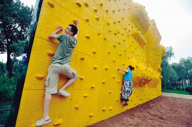 室外攀岩有附牆式的攀岩和獨立式攀岩(yán)。主要材質有玻璃鋼材質,由鋼架基礎以及(jí)岩板,岩點組成。