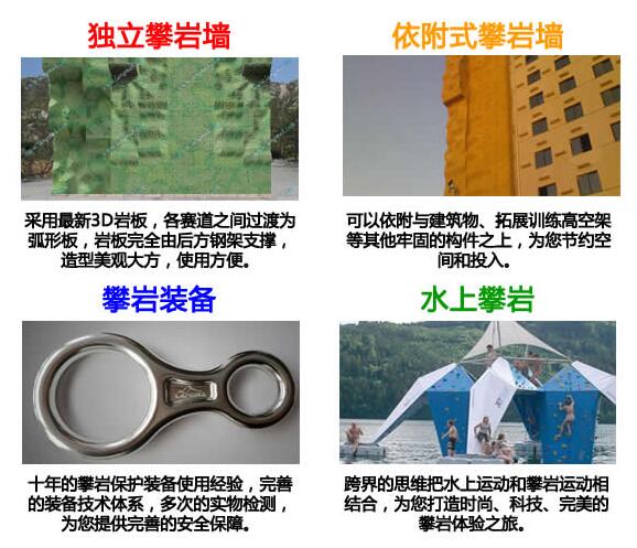 獨立式攀岩牆:指岩板(bǎn)、支點等安裝在獨立的鋼構基架上的岩場設施,由支(zhī)撐結構(gòu)、攀登麵、岩點係(xì)統、上(shàng)方保護係統四部分組(zǔ)成。