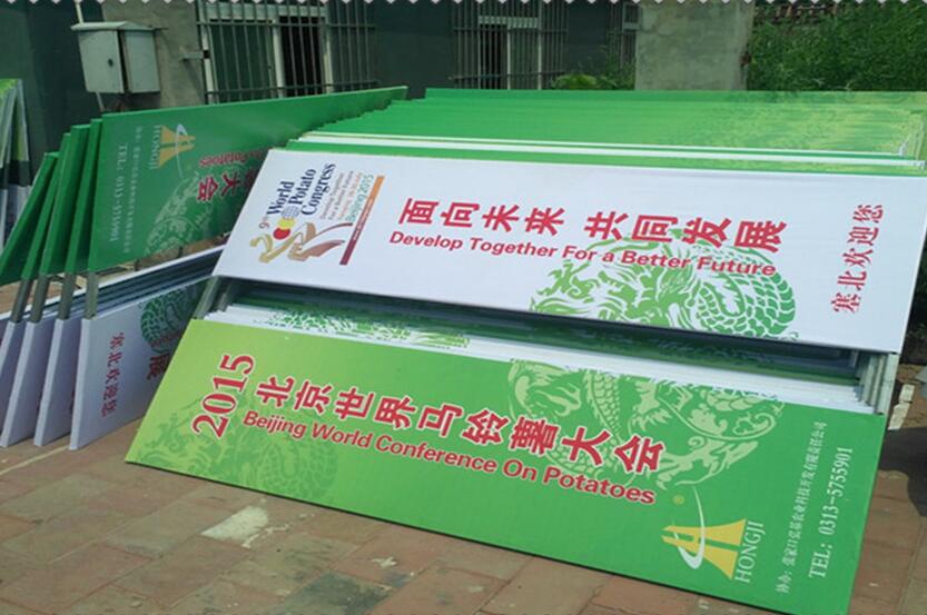 道旗一般采寶麗布噴繪,戶外寫真布(bù)噴繪,熱轉印旗幟布等 。可以(yǐ)做單噴單看、單噴雙(shuāng)看(kàn)和雙噴雙看等效果,還有全彈滌綸或牛津布麵料,運用高溫分散染料透印(yìn)工藝:布正反麵顏色一樣(yàng),無色差,圖形與旗麵柔軟度一樣,水洗日曬不掉色。但色彩效果不如噴繪布,並且(qiě)噴繪布的防水(shuǐ)性也(yě)要(yào)比滌綸(lún)布針織布好。道旗的尺寸一般有:60×190、80×240 、120×350等常用規格(gé),也可以根據要求尺寸的製作道(dào)旗。路邊道旗。設置路邊道旗的總高度不超過2米。三角形道旗,其立邊長度(高度(dù))不超過0.5米,底邊長度(寬度(dù))不超過0.5米;方(fāng)形道旗,其立邊(biān)長(zhǎng)度(高度)不超過0.7米,底邊長度(寬度)不超過0.5米。