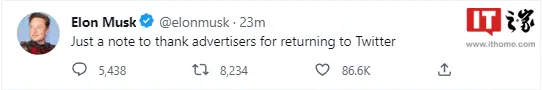 IT之家 12 月 4 日消息,埃隆-馬(mǎ)斯克證實,蘋果已經“完全恢複了(le)在推特上的廣告”。隨後,他在推特(tè)發文稱感謝(xiè)廣告商(shāng)們重(chóng)返推特。